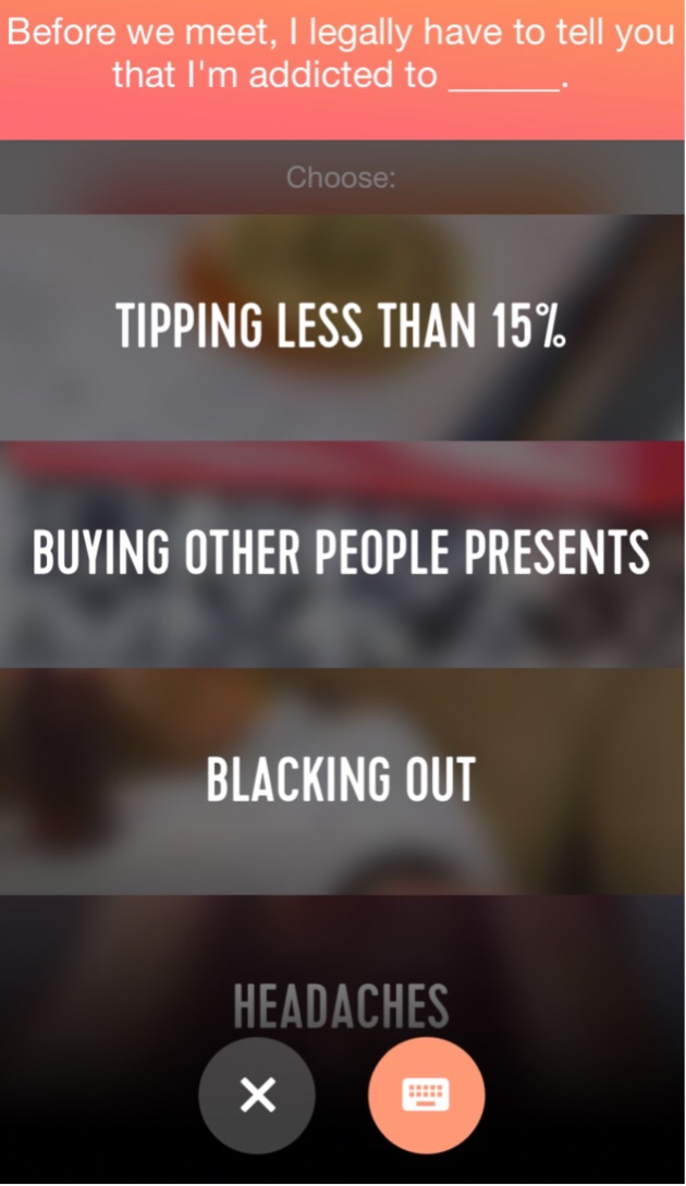 Another interesting feature of Hater is that the app attempts to do the heavy-lifting of initial messaging for you. The app offers a creative ice-breaker for you, in the form of Mad Libs-style sentences that you can fill in with your own silly responses. There’s no worry of having to send a limp, “Hey” out into the void.