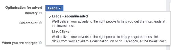 In your bidding, make sure you optimize for leads vs. link clicks. Link clicks may result in a higher click-through rate but you should always optimize for what your true goal is, which is simply leads in this case.