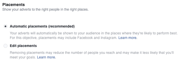 Under Placements, select the Automatic Placements option, because that only includes the Facebook news feed and Instagram anyway. Audience network and all other Facebook placements are ineligible.