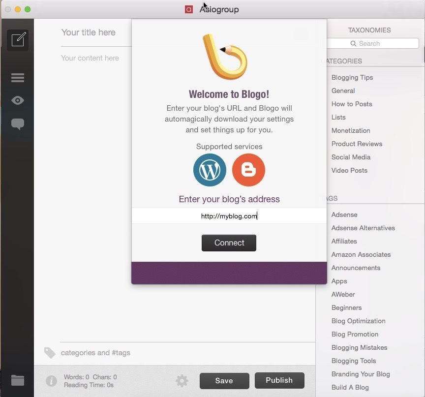 Setting up your blog with Blogo is easy, just put the blog URL to it and your are asked to put your login credentials to it. You can save the theme of your blog for a live preview of your posts. You need to enable the xmlrc in the WordPress which gives Blogo the ability to post on your blog.