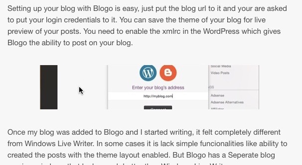 Once my blog was added to Blogo and I started writing, it felt completely different from Windows Live Writer. In some cases, it lacks simple functionalities, like writing posts in theme layout editor. But, Blogo has a Separate blog preview windows that looks much better than Windows Live Writer’s preview.