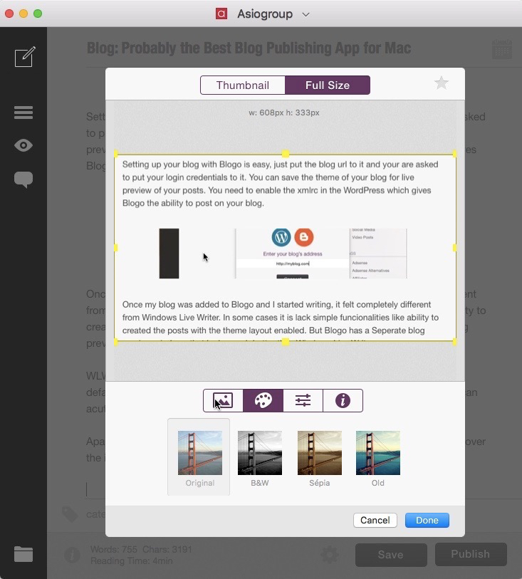 Blogo also includes an Image Editor, which has some basic tools you can use to make changes to the images you insert.
