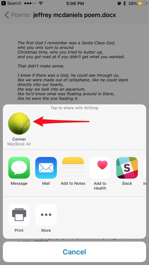 • Near the top of the Share menu, you’ll see Tap to share with Airdrop. Below that any available devices to receive your Airdrop will appear.