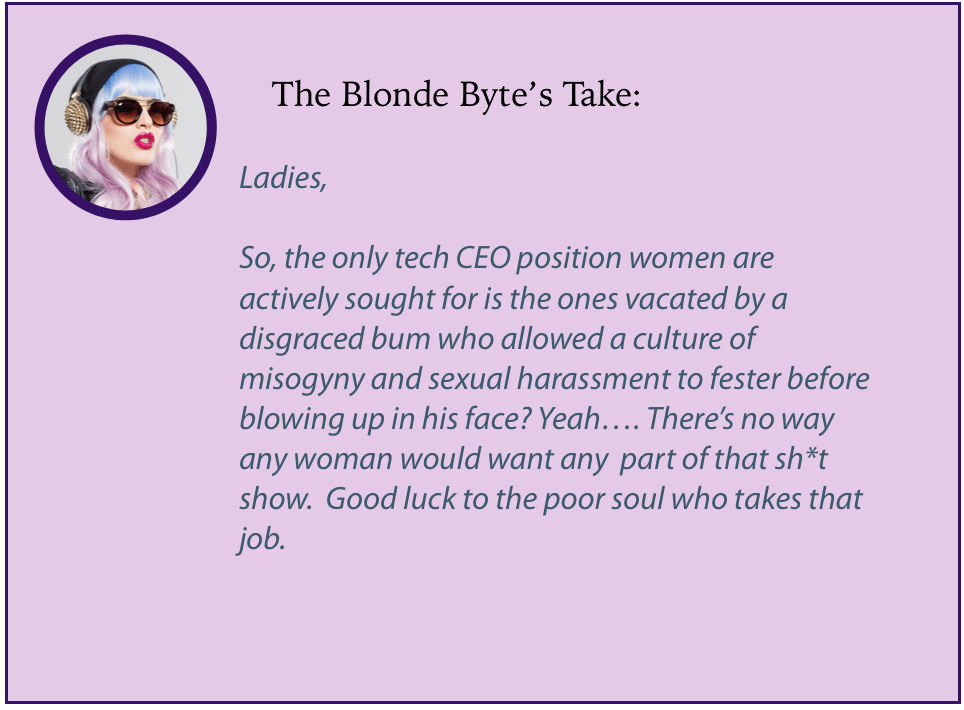 While there are many reasons Kalanick’s detractors on the Uber board might be desperate for a fresh direction, and especially a new CEO who is not an old white dude, all of these factors could help explain the embarrassingly handled search for a new CEO. Who wants to become the public face of Uber’s failure if the company continues to tank? And who wants to become the female CEO blamed for not cleaning up Kalanick’s mess?