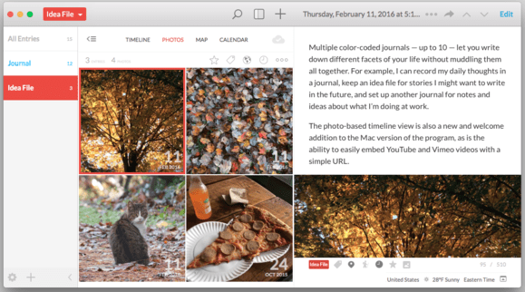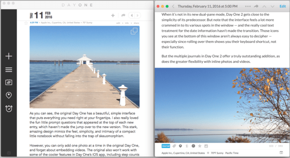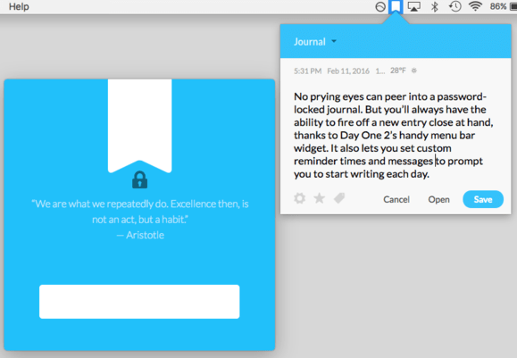 It’s still a snap to start typing a new entry in Day One 2, either from the app itself or its convenient menu bar widget. The latter also provides customizable reminders to write down your thoughts at a given time. Day One 2 tags entries with the date, time, any custom tags you care to create, the current weather, and your GPS-based location.