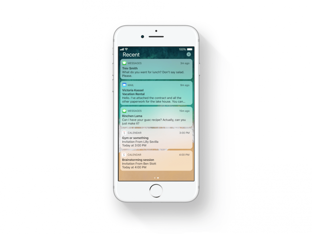 In iOS 11, all your notifications — both recent and missed — are in one place, with no separate tabs. Just pull down from the top of the screen to see everything at once.