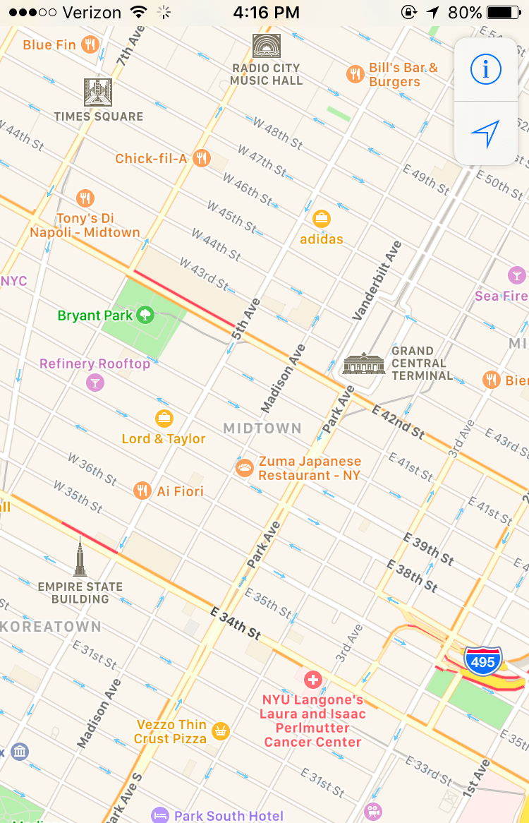 Even though I’m currently in New York City, Apple Maps will tell me weather of any place I look up. In the screenshot above, you’ll see a little box on the right side of the screen that shows it was 83 degrees and cloudy at Camp Randall Stadium when I did this search. And this works for any location.