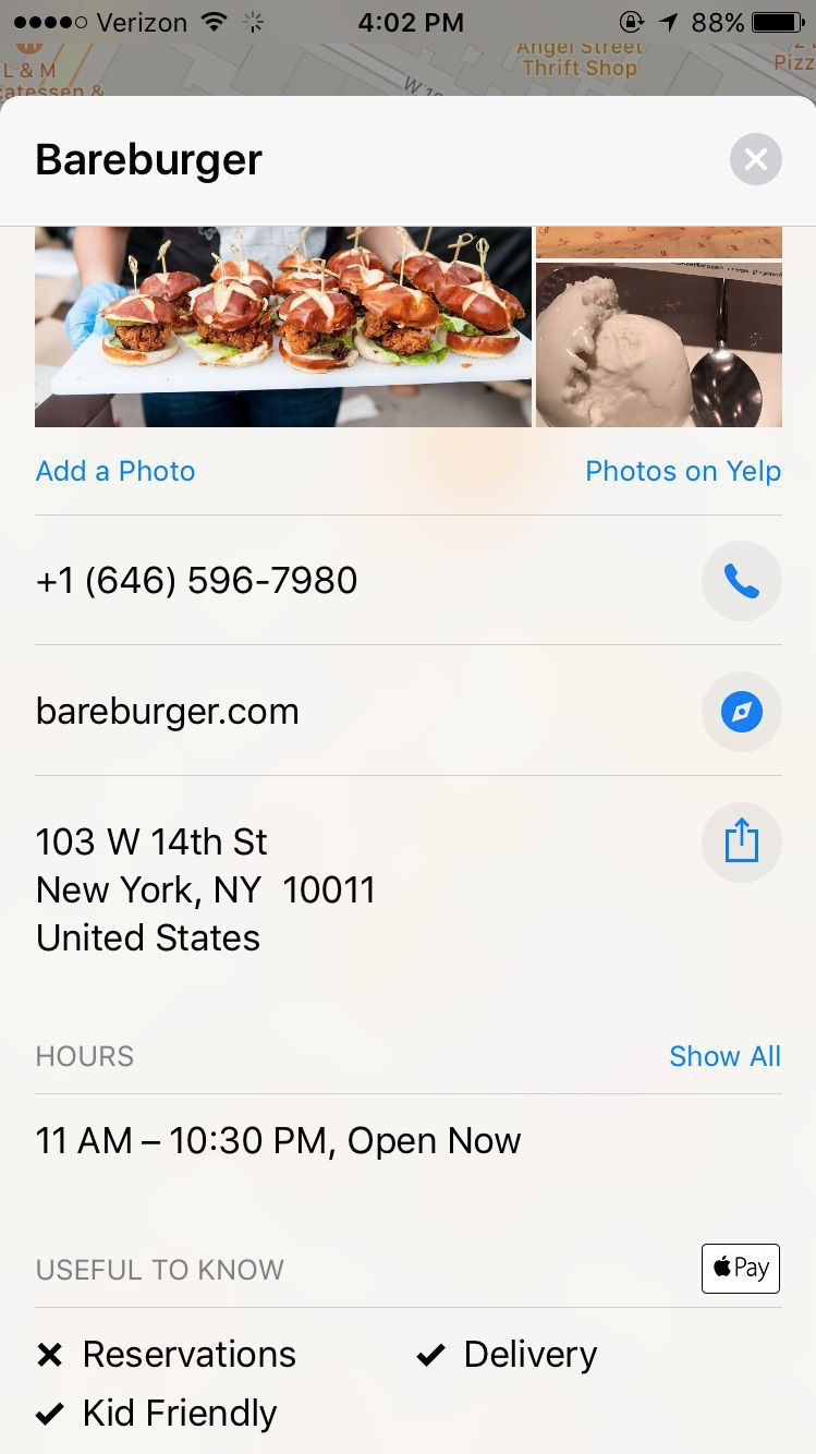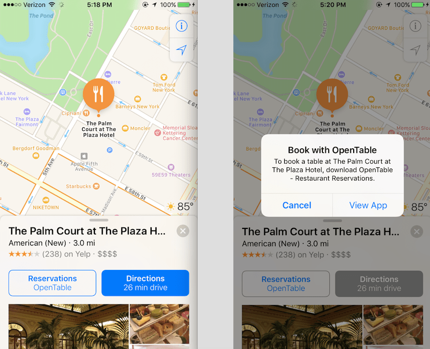 Who calls to make a reservation these days? Even for the people who don’t mind picking up the phone, a lot of restaurants only accept online reservations now. Apple Maps includes a link to Open Table so you don’t have to look it up in a separate search. Although you’re still redirected to the Open Table app, it’s still a time saver.
