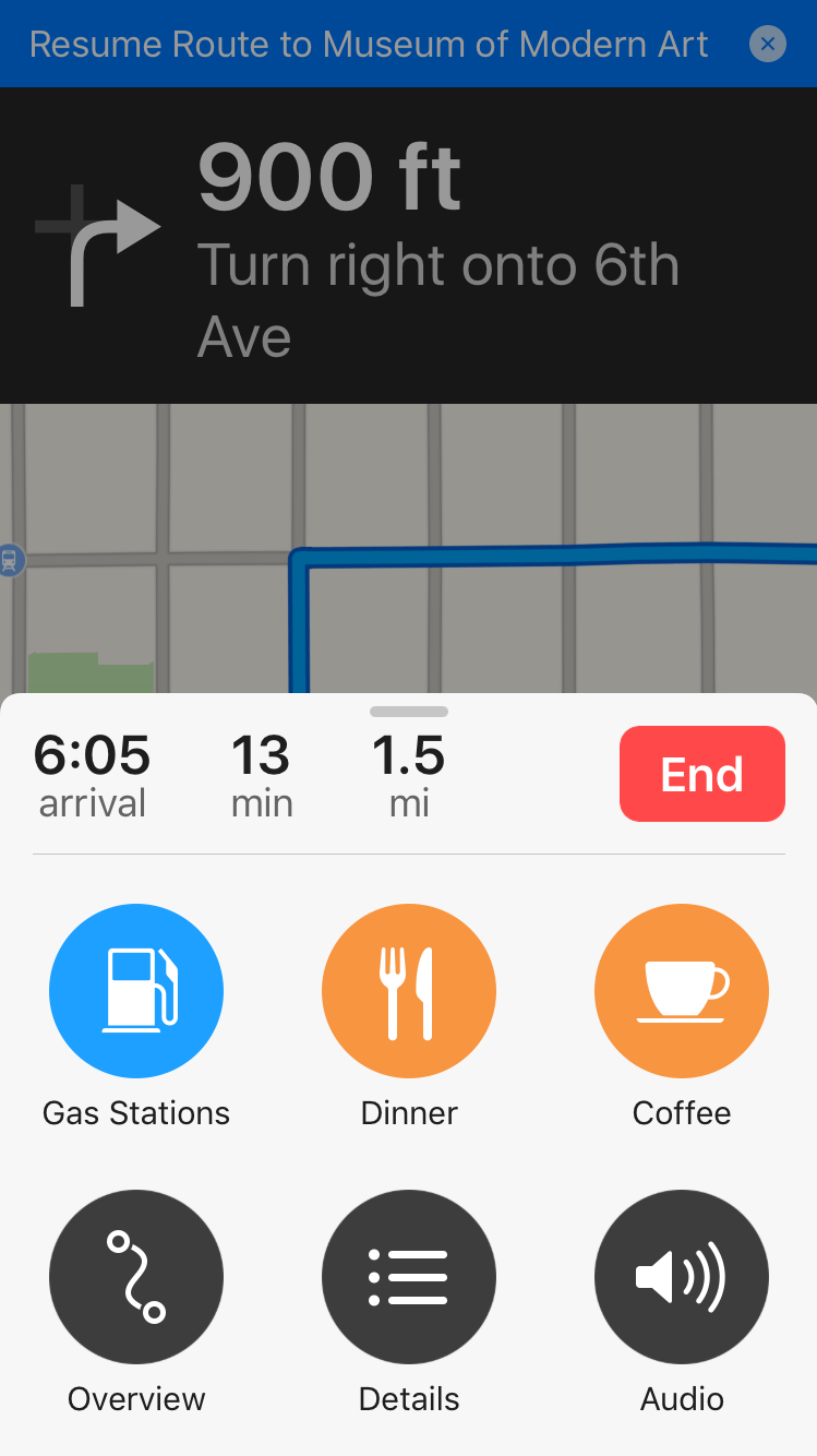To do this, swipe up from the bottom of the screen and choose which option you need to see nearby locations. Once you choose one, Apple Maps will account for time added on to your trip. When you’ve reached your detour, just hit “End” and resume on your original route.