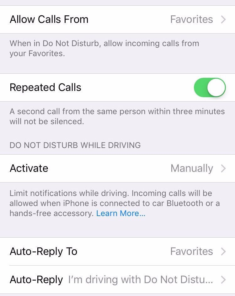 Do Not Disturb While Driving and all of its features can be turned on and customized in Settings > Do Not Disturb.