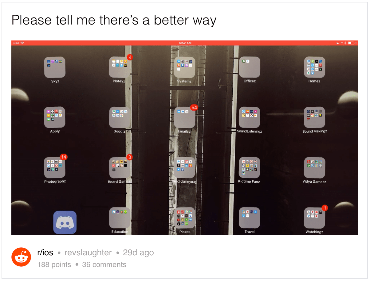 Some functions in iOS are more user-friendly than others, and rearranging apps definitely isn’t one of the better ones. The concept is simple enough — long-tap on any app icon to enter “jiggle mode,” then drag and drop icons wherever you want — but it’s messy and frustrating in practice. Move too close to a corner and the page will accidentally switch, and forget about trying to drop an app into a folder. Just look at the video from this post on Reddit: