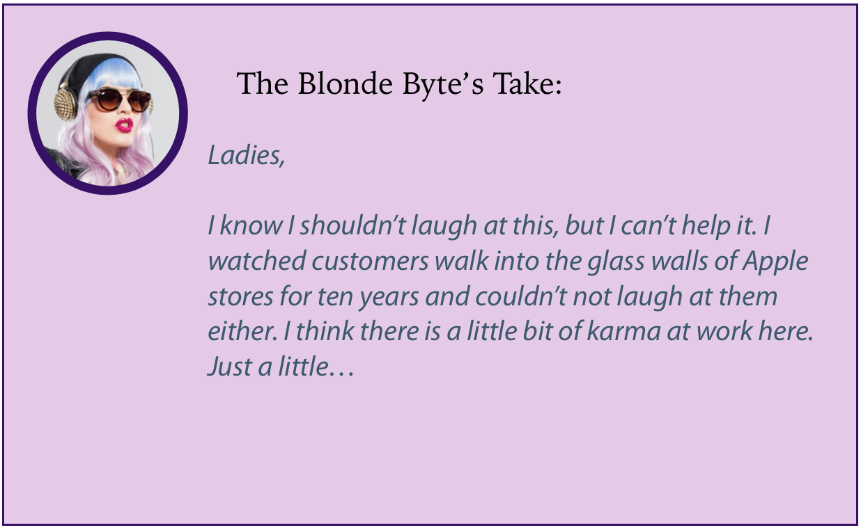 It’s not the first time Apple’s penchant for glass in buildings has caused problems. In late 2011, 83-year-old Evelyn Paswall walked into the glass wall of an Apple store, breaking her nose. She sued the company, arguing it should have posted a warning on the glass. The suit was settled without any cost to Apple, according to a legal filing in early 2013.