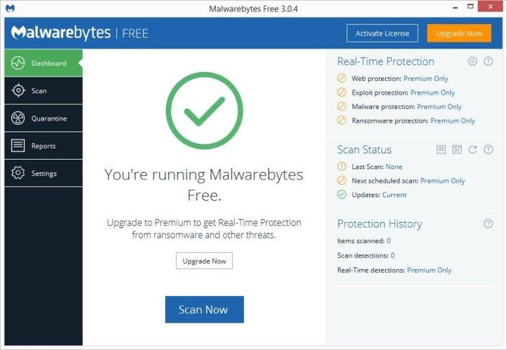 The main window of the free software looks quite a bit different from that of the previous version. A simple menu runs down the left side, and a right-hand panel reports protection status. All of the premium features are listed, but disabled and marked “Premium Only.” The dashboard tab reports your security status, with a big button to launch a scan. The layout is still simple and straightforward. Most days, you’ll just load it up and click the Scan button.