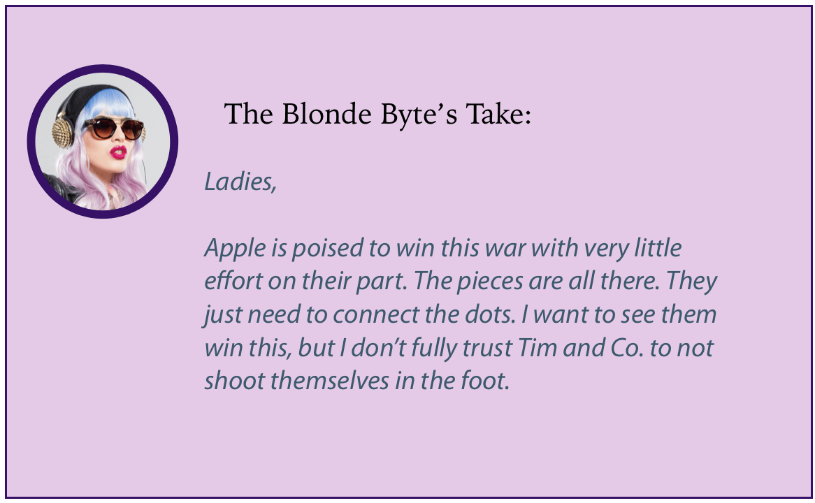 We think that only Apple can make medical surveillance bearable, much less cool. Which makes an Apple Watch, smart bands, and a case that does it all, an essential purchase. At that point, the Watch system is a lot more than just a $400 watch and the market isn’t just consumers—it’s employers and insurers who figure out the new economics of health as a platform service. The overall market for watches is likely smaller than phones but Apple’s competitive advantages in design, technology, and data security could give it a significantly higher market share in watches.