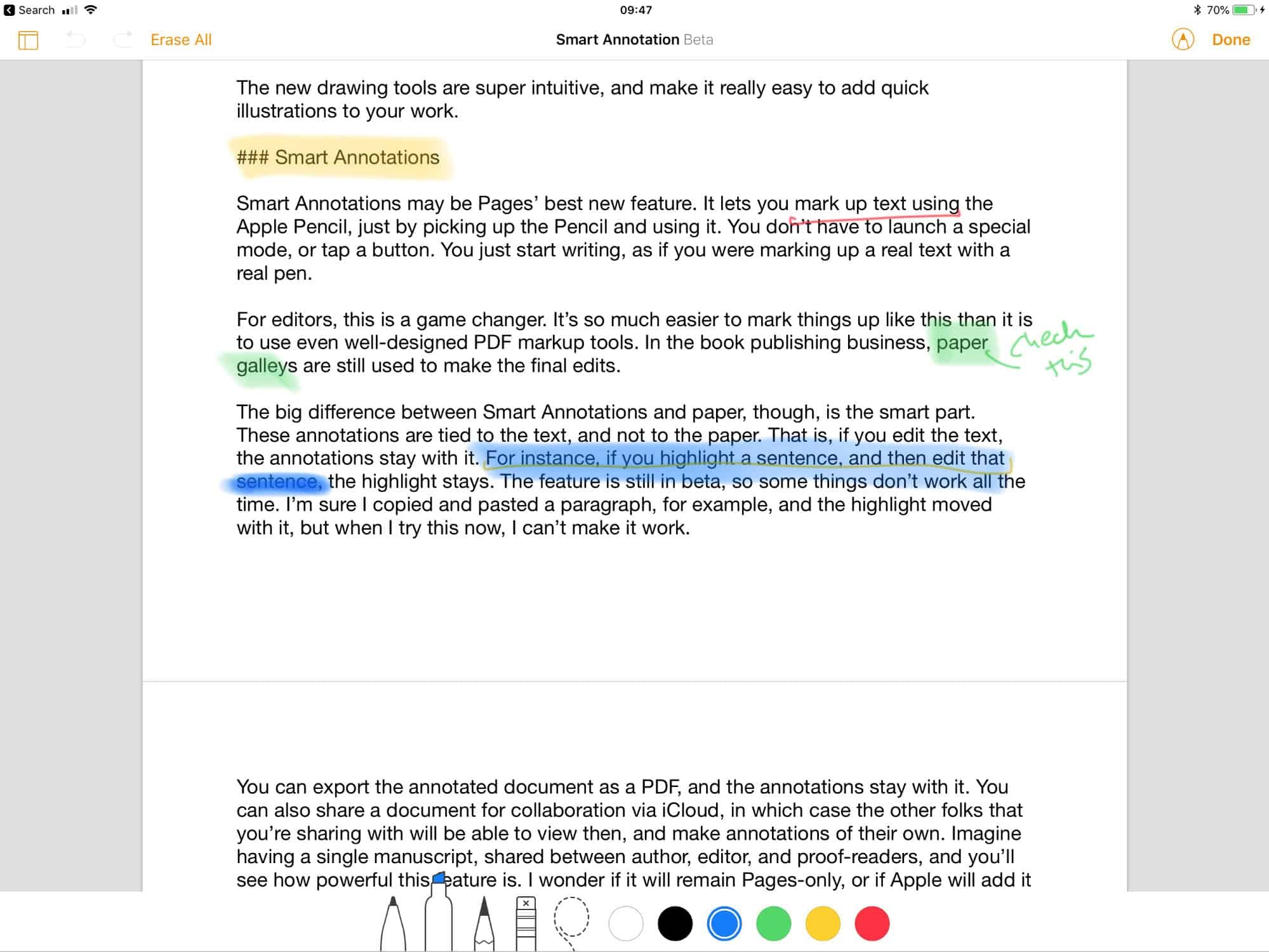 Smart Annotations may be Pages’ best new feature. It lets you mark up text using the Apple Pencil just by picking up the stylus and using it. You don’t have to launch a special mode, or tap a button (although there is a button if you insist on doing it this way). You just start writing, as if you were marking up text on real paper with a real pen.