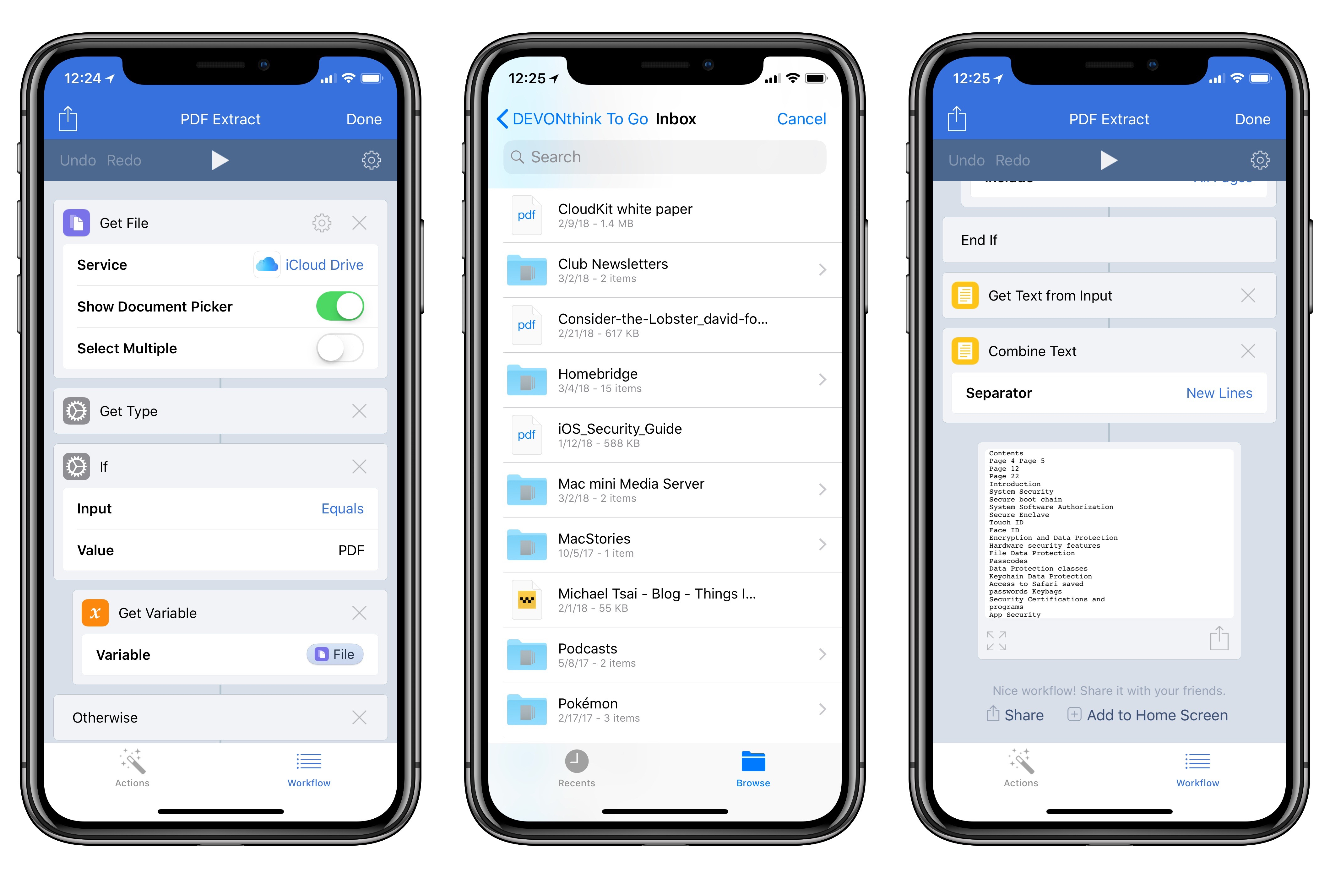 Perhaps even more impressively, the performance of Workflow’s PDF-to-text conversion is astounding: Apple’s iOS Security Guide, a 78-page PDF document, is converted to plain text in 1 second by Workflow on a 2017 iPad Pro. I’m going to have fun thinking of how Workflow can now fit in my paperless workflows and DEVONthink usage. In the meantime, here’s a workflow I made to pick a PDF with an iOS 11 file picker (which supports both iCloud Drive and third-party locations), extract its text, and merge multiple pages into a single plain text block.