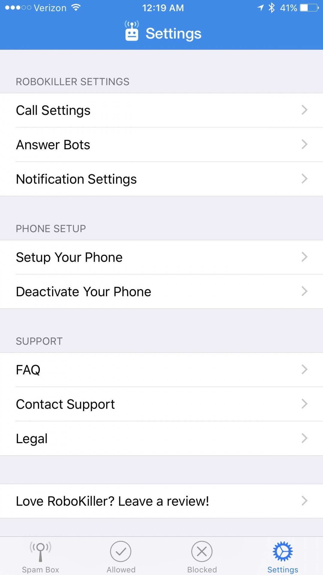 Once you finish the set-up process you will immediately be taken to your Spam Box, which will show you some stats and give you the option to review your recent blocked calls. One of the really cool things about the app is the setting for Answer Bots. What this does is give you a chance to give spammers an actual recording to respond to. Some of these options include Number Disconnected, What’s Going On?, or Bad Cold. I like this feature because it provides users with a chance to sort of get back at their spammers.