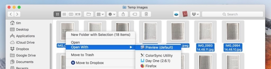 In Finder, select all the images you want to include in the PDF. To do this, drag a box over several images files using your mouse cursor, or select them individually by holding the Command key and clicking them one by one.