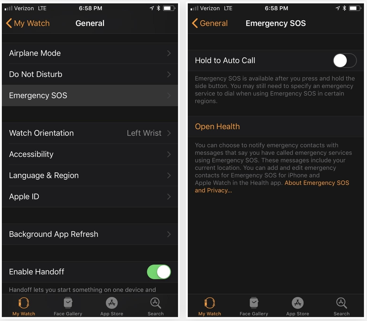 There are plenty of stories of Apple Watch owners having the police show up unexpectedly. Some triggered the call while sleeping, while others have triggered it when changing Watch bands. To keep this from happening, just make sure “Hold to Auto Call” is disabled.
