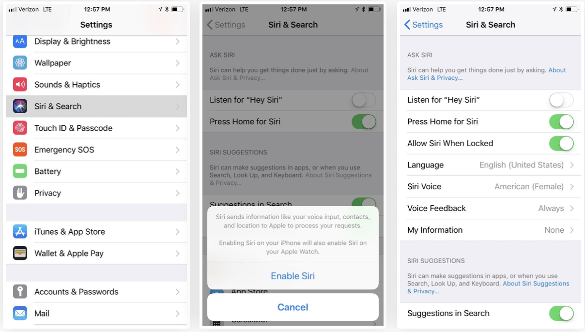 If you cannot toggle it on, you likely have Siri turned off on your iPhone. While “Hey Siri” does not need to be enabled on your iPhone, Siri itself does need to be in order for it to work on your Apple Watch. On your iPhone, open up Settings, then select “Siri & Search.” On the next screen, make sure “Press Home for Siri” or “Press Side Button for Siri” is toggled on. If not, tap it, then “Enable Siri” on the popup. Then try enabling “Hey Siri” on your Apple Watch again.
