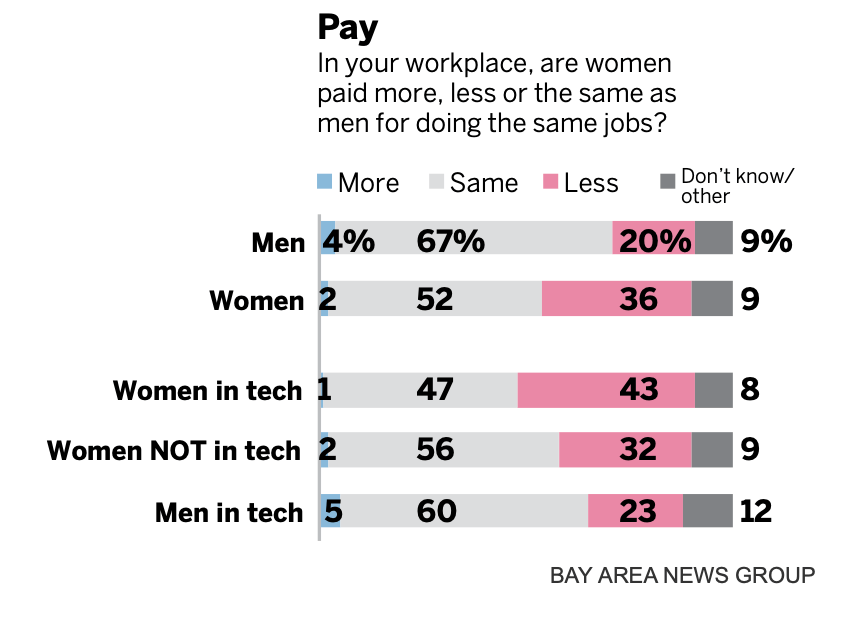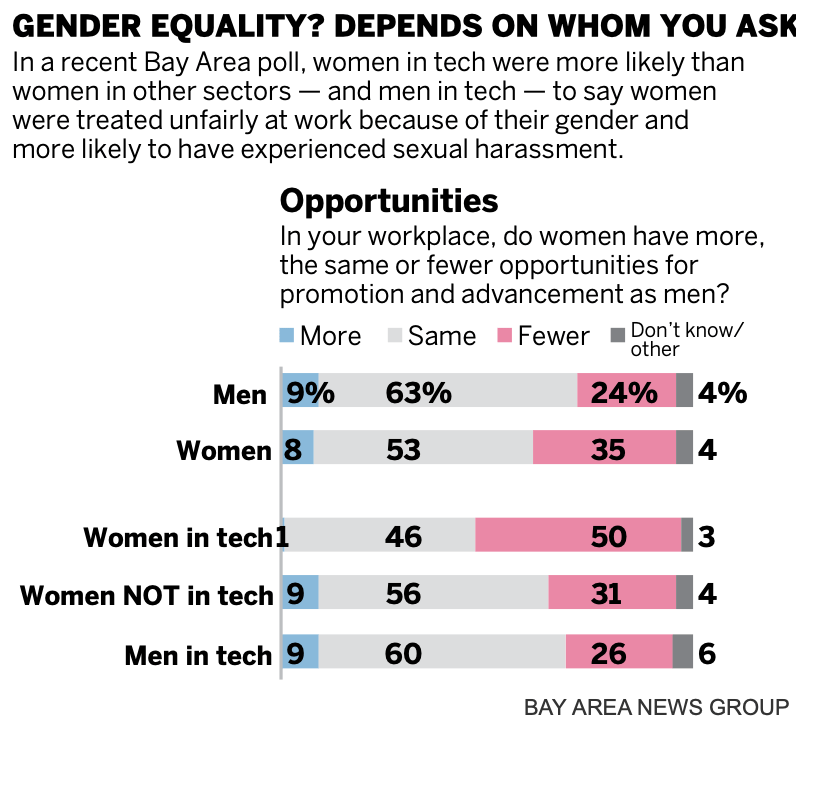 Women in the Bay Area’s male-dominated tech world have a strikingly dimmer view of gender equality at work than women in other sectors, according to a new poll that offers the deepest look to date at local employees’ attitudes on pay parity, workplace opportunity and sexual harassment.