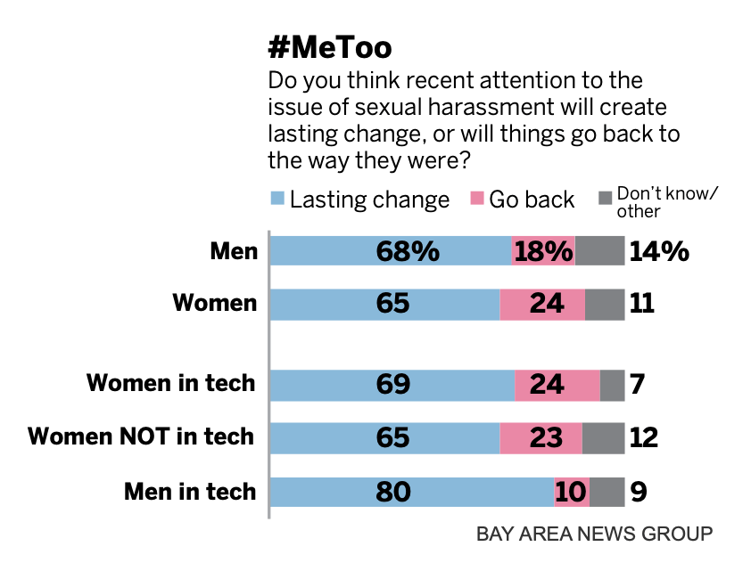 The poll did find an overwhelming belief — among tech workers and those in other fields — that the changes propelled by the #MeToo movement are here to stay. About two-thirds of those surveyed, including 71 percent of women under 40, predicted the recent attention to the problem of sexual harassment would bring lasting change, slightly higher than the findings of a similarly worded national poll earlier this year.