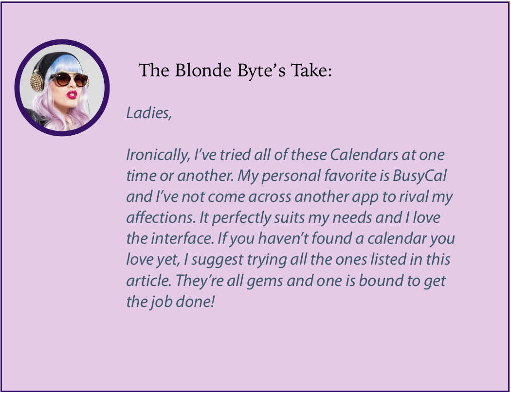 Calendar apps for iPhone are a tough thing to advise for because different people use them in different ways. Some people are busier than others (meeting wise), and others use their calendar as a to-do system (personally I question your sanity if you are this way). All of the primary calendar apps I tried are great but might not fit how you use a calendar app.